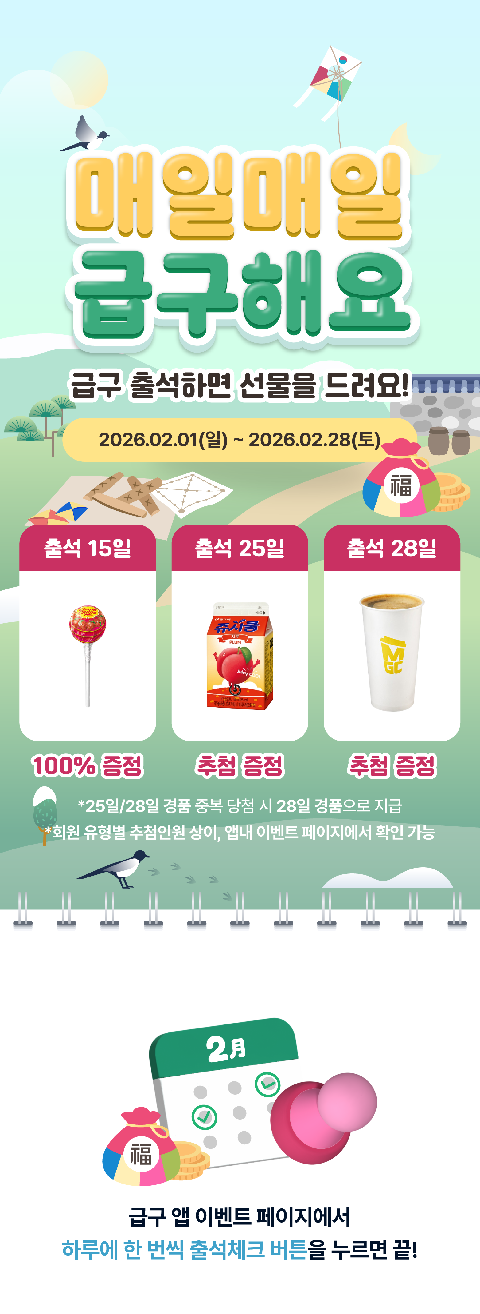 Feb 1, 2026 이벤트 [EVENT] 2월 출석체크 이벤트🎁 Written by: 급구 하루만 알바가 필요할 때, 급구! 믿을 수 있는 내 주변 알바를 급구에서 쉽고, 빠르게 구해보세요 :) Member discussion: