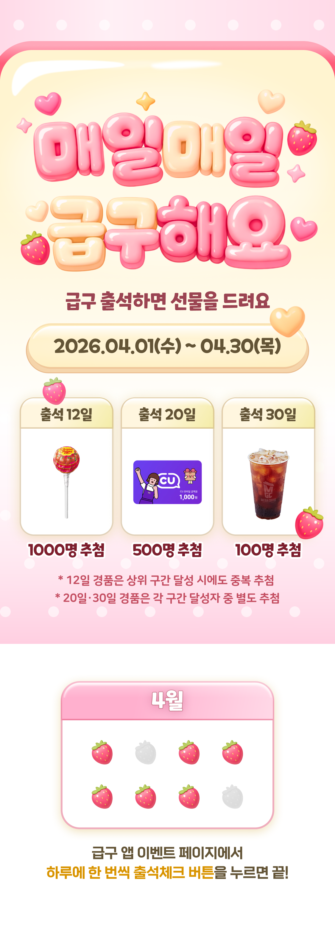 Apr 1, 2026 [EVENT] 4월 출석체크 이벤트🎁 Written by: 급구 하루만 알바가 필요할 때, 급구! 믿을 수 있는 내 주변 알바를 급구에서 쉽고, 빠르게 구해보세요 :) Member discussion:
