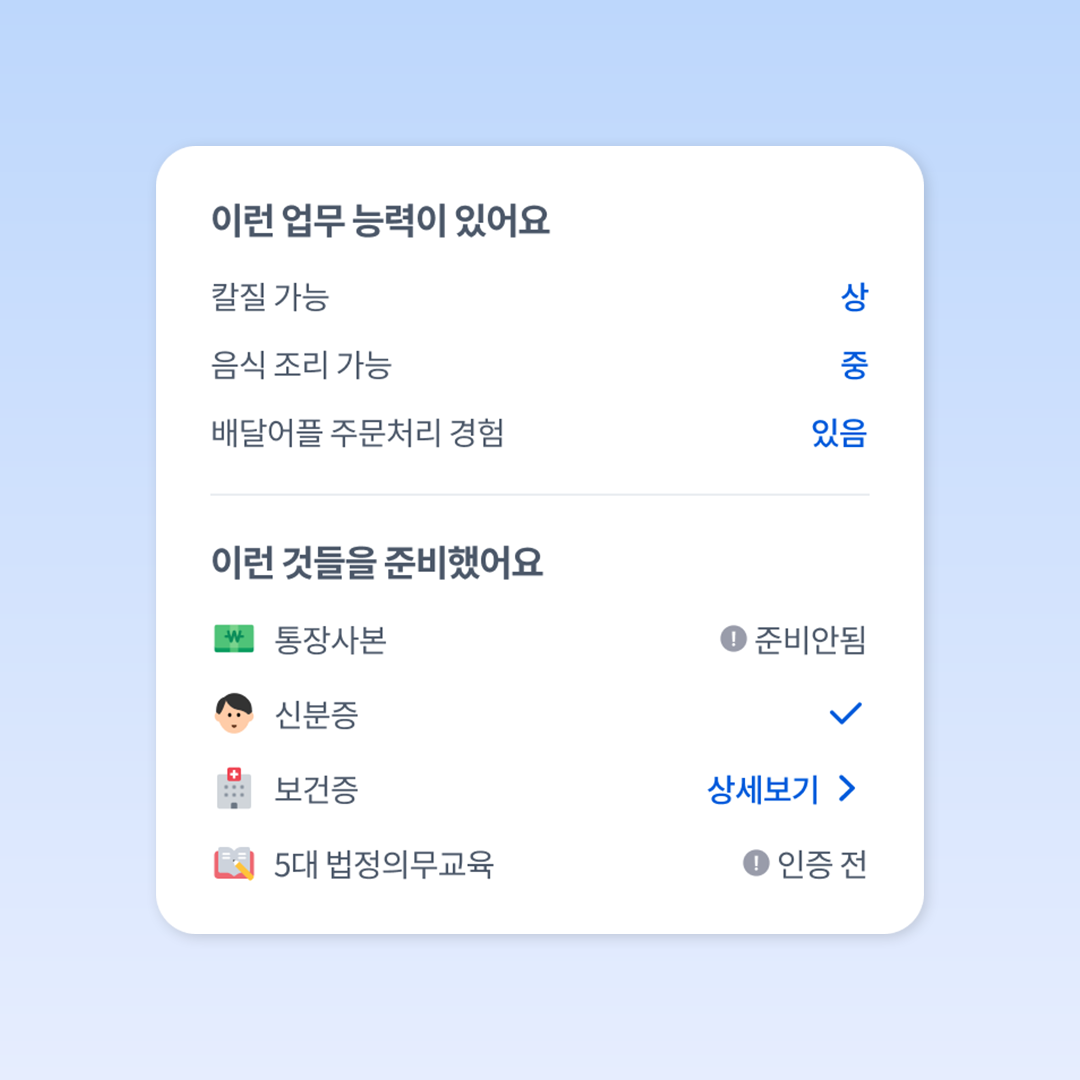 급구에서 알바 분들이 지원을 하시면 이력서에 지원자가 직접 자신의 능력을 상중하로 평가한 내역이 보여요.