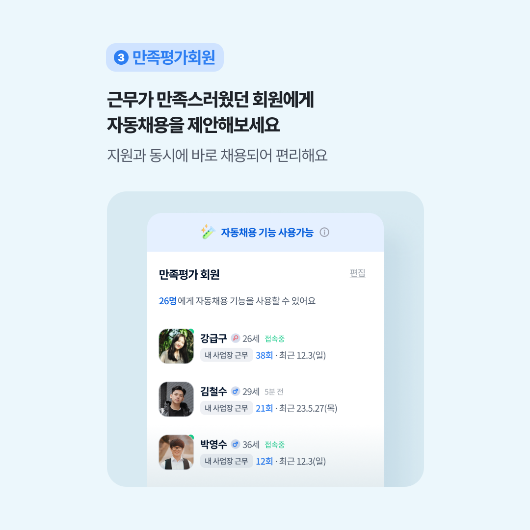 ✔️ '만족해요'로 평가한 회원들에게 근무알림을 보내 자동으로 채용이 진행 돼요