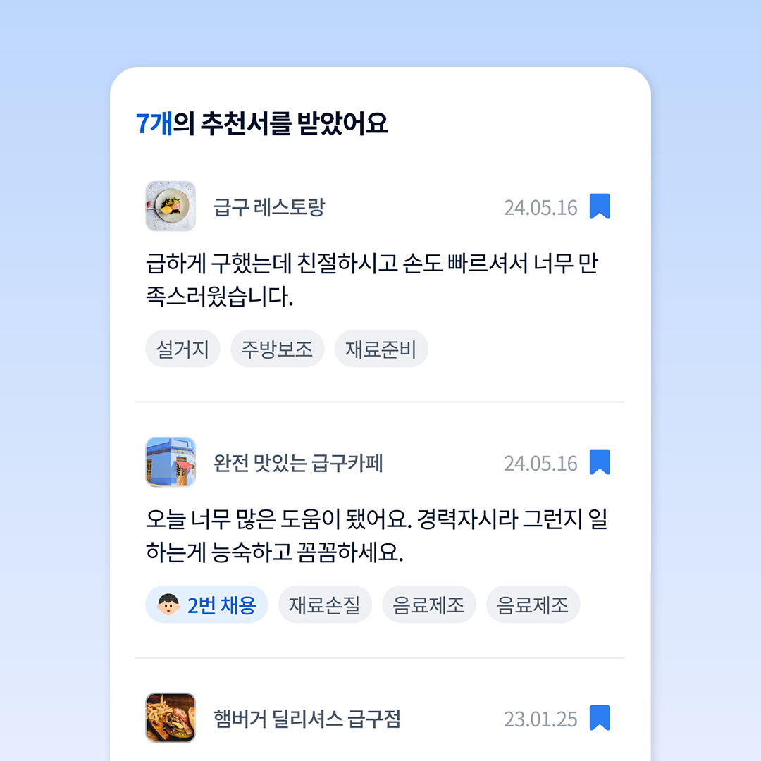 급구에서는 이러한 과정을 줄이기 위해 이력 데이터를 구조화해서 제공해요. 사장님은 여러 지원자의 정보를 한눈에 비교할 수 있고, 채팅을 통해 비대면으로 소통하면서 빠르게 채용을 확정하실 수 있어요.